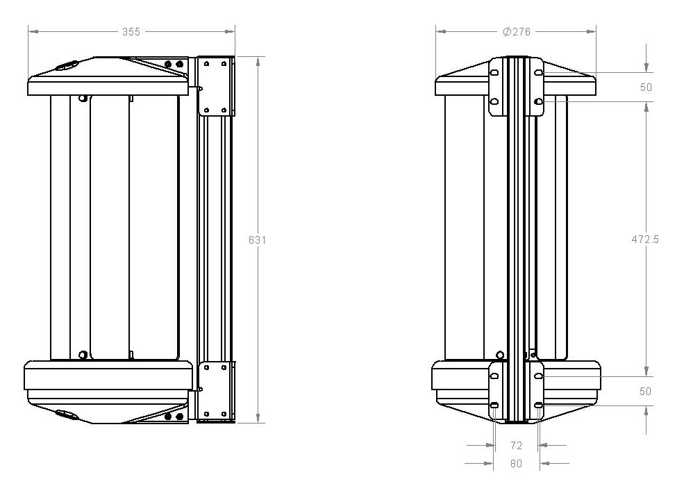 Extruded aluminium spine and ruggedised brackets for mounting on 50mm OD pole