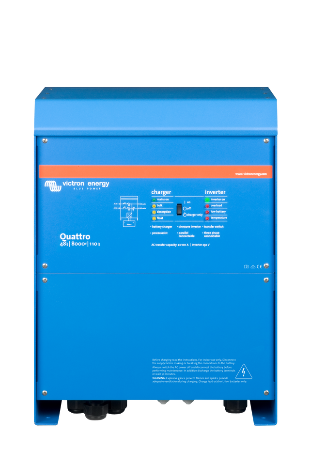 Similar to the MultiPlus, the Quattro 48/8000/110-100 is also a combined inverter and charger. Additionally it can accept two AC inputs and automatically connect to the active source. Its many features include a true sine wave inverter, adaptive charging, hybrid PowerAssist technology plus multiple system integration features such as three or split phase operation and parallel operation.